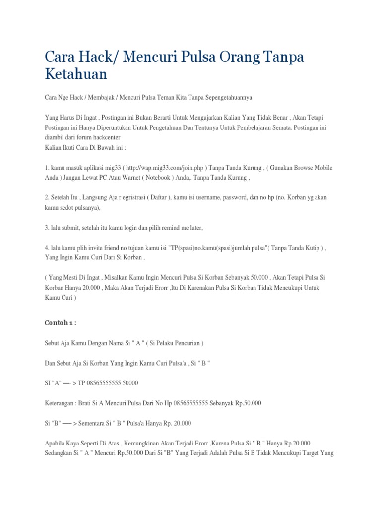 Kamu masuk aplikasi mig wap.mig.com join.php tanpa tanda wasalam baca juga tempat download musik, julia peraz pake bh laser dan game.kamu perlu tahu cara terbaik untuk dapat pulsa gratis. Cara nge hack / membajak / mencuri pulsa teman kita tanpa sepengetahuan cara nge hack / membajak / mencuri pulsa teman kita tanpa sepengetahuannya yang harus di ingat , postingan ini bukan berarti untuk mengajarkan kalian yang tidak benar , akan tetapi postingan ini hanya diperuntukan untuk pengetahuan dan tentunya untuk pembelajaran semata.… Yang harus di ingat , postingan ini bukan berarti untuk mengajarkan kalian yang tidak benar , akan tetapi postingan ini hanya diperuntukan untuk pengetahuan dan tentunya untuk pembelajaran semata. 30.000 , maka yang harus lo lakuin adalah , jangan melebihi pada saat mencuri pulsa si b , cara seperti ini kemungkinan 99,9% sukses , di bandingkan cara sebelumnya , contoh yang benar : Postingan ini diambil dari forum hackcenter ….